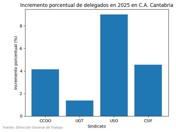 Durante el último año, USO ha pasado de 466 a 508 delegados, lo que supone un incremento neto de 42 representantes sindicales. Este avance se traduce en un crecimiento del 9,01 %, el mayor de todas las organizaciones sindicales presentes en la región y muy por encima de la media del sector que sitúa a CSIF con incremento del 4,5% y 8 delegados más, CCOO crece 60 delegados y llega al 4,1% y en última posición UGT con un incremento del 1,3% con 20 nuevos representantes. Con este incremento USO sitúa su representatividad sindical en Cantabria a una décima de conseguir un histórico 12%.